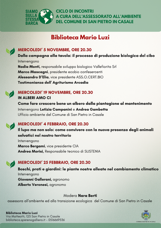 - 05,19/11/2025 e 04,25/02/2026 San Pietro in Casale - Siamo sulla stessa barca. Ciclo di incontri a cura dell'assessorato comunale all'ambiente