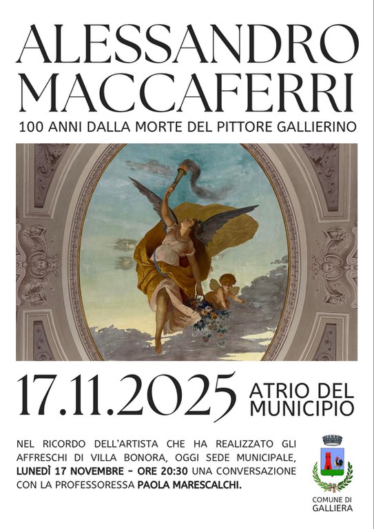 A100 anni dalla morte del pittore gallierino Alessandro Maccaferri, artista che ha realizzato gli affreschi di Villa Bonora, oggi sede municipale, lunedì 17 novembre l’atrio del Comune ospita una conversazione con la prof.ssa Paola Marescalchi.