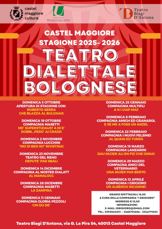 Dal 5 ottobre 2025 al 12 aprile 2026, il Teatro Biagi d'Antona di Castel Maggiore ospita la rassegna di Teatro Dialettale Bolognese curata dalla Compagnia “I Grigioro”