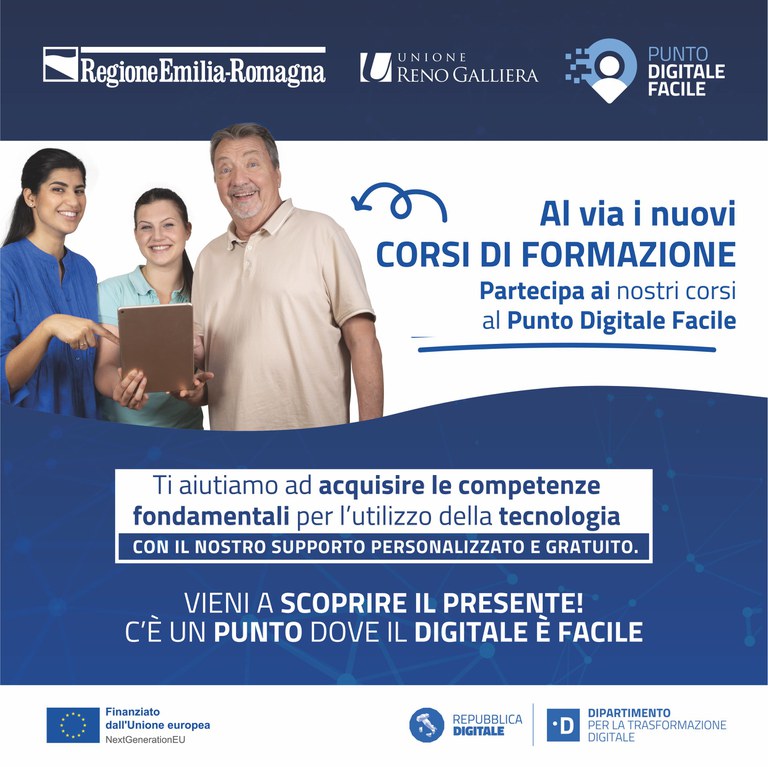 Partono i corsi autunnali (NUOVI CONTENUTI) di alfabetizzazione digitale, parte del progetto "Digitale Facile" che ti aiutiamo ad acquisire le competenze fondamentali per l’utilizzo della tecnologia digitale. I corsi, completamente gratuiti, realizzati in tutti i Comuni dell’Unione Reno Galliera e condotti da facilitatori digitali esperti, sono pensati per facilitare la vita di tutti i giorni con smartphone, computer, servizi on line: come usare la carta d’identità elettronica (CIE), l’APP IO, whatsApp e Facebook ma anche per scansionare un documento con lo smartphone, gestire al meglio il computer, la connessione Wifi.