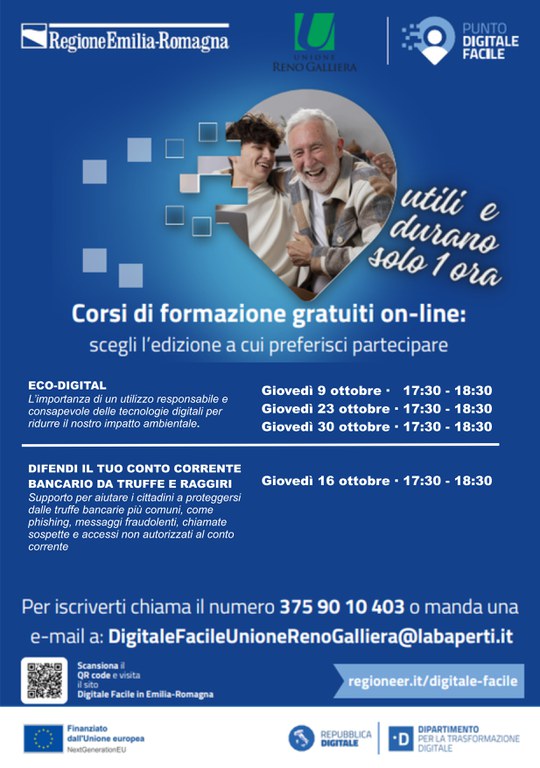 Iscrizioni: il tel. 375 90 10 403 | DigitaleFacileUnioneRenoGalliera@labaperti.it | Numero Verde Regionale: 800 141147