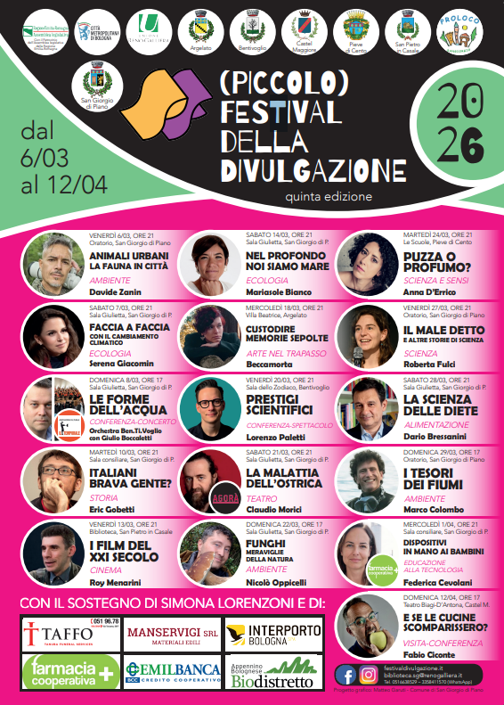La quinta edizione del (Piccolo) Festival della divulgazione animerà il territorio dell’Unione Reno Galliera dal 6 marzo al 12 aprile 2026, con un calendario diffuso che coinvolgerà biblioteche, sale civiche, teatri e spazi culturali dei Comuni dell’Unione.