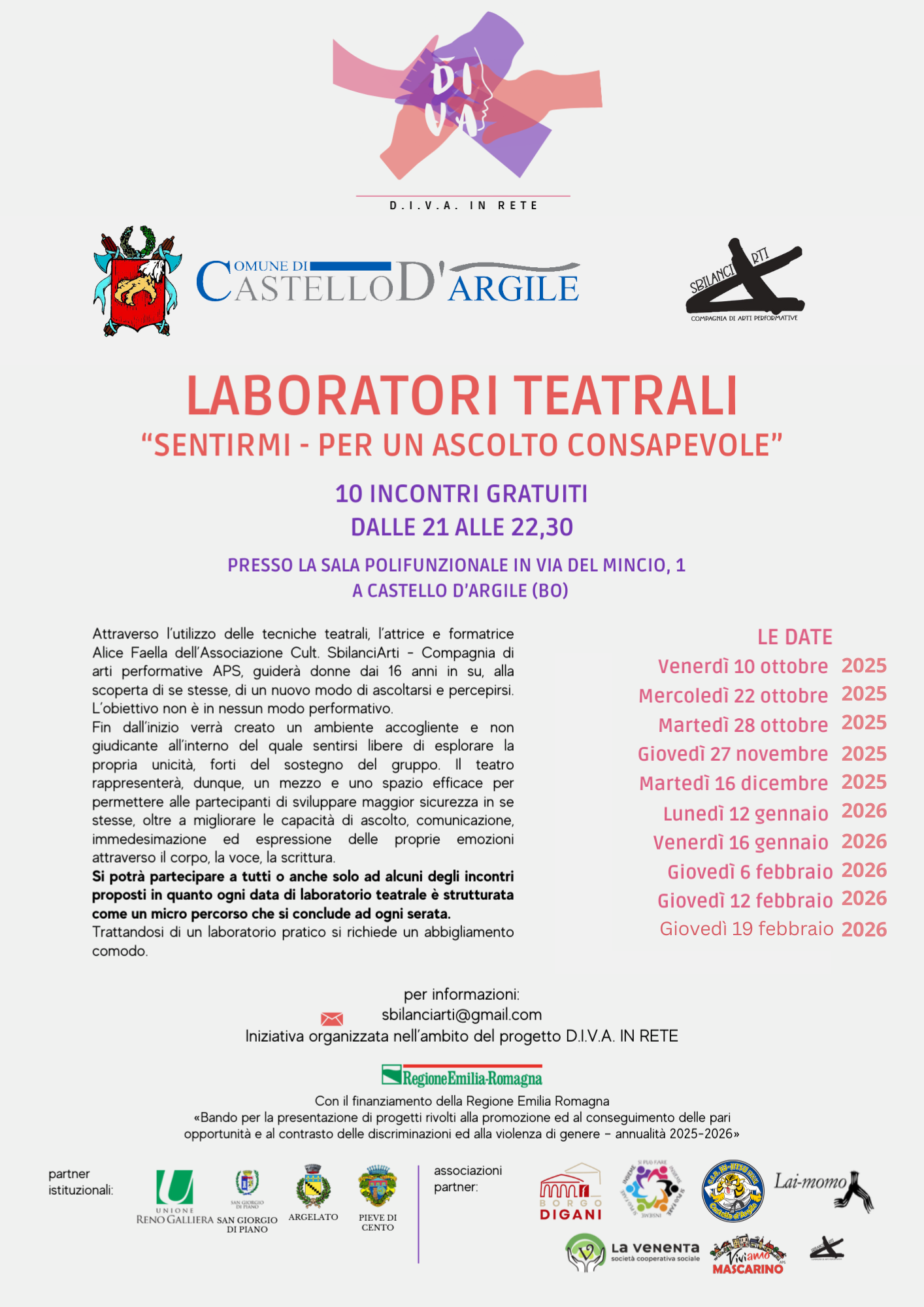Dal 10 ottobre 2025 al 19 febbraio 2026 si tiene a Castello d'Argile un ciclo di dieci laboratori teatrali gratuiti, rivolto a donne dai 16 anni in su.